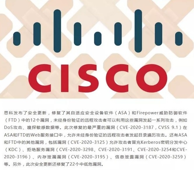 5、思科发布安全更新,修复多个产品中的12个漏洞