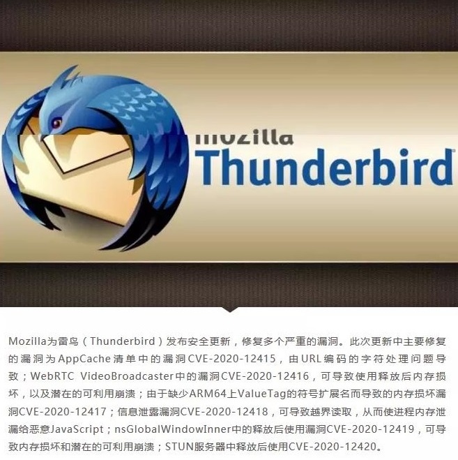 1、Mozilla发布雷鸟安全更新,修复多个严重的漏洞