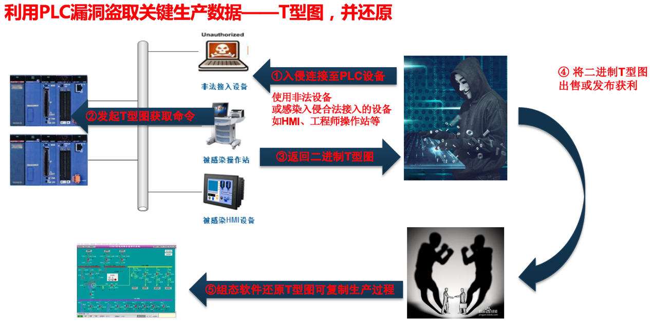 攻击方式如下:攻击T型图前,先普通PC接入PLC所在网络,利用漏洞向PLC发送获取梯形图指令脚本,获取PLC程序后,通过组态软将T型图还原;在分析流程、工艺、材料、用量后,黑客可非法出售企业生产工艺获取高额利润,对企业造成致命威胁。具体攻击过程如图所示: