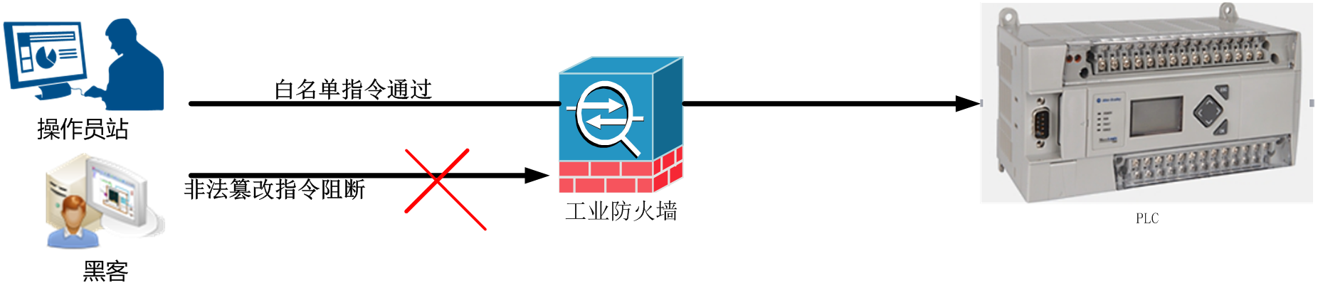 那么第二种方案,在工控设备前部署安全防护设施是目前比较可行的防护方案。通过在PLC前部署工业防火墙,来对PLC设备进行安全防护的功能。