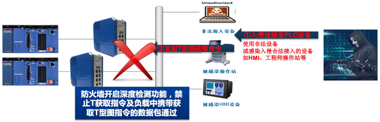 该工业防火墙可开启深度检测功能,禁止T型图获取指令及负载中携带获取T型图指令的数据包通过,因此,该工控防火墙适合工控生产环境,提供协议级、指令级安全过滤能力,如下图所示:
