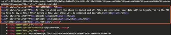 锁定页面htmllocker是从远程服务器动态获取到的并保存在其配置文件set.xml中,如图12,我们可以看到FBI WARNING的勒索信息:告知受害用户的手机被锁定,并且所有的文件被加密,用户的数据将会被传送到FBI,除非受害用户支付罚金方可解密。