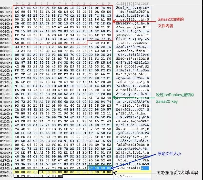SalsaKey(32字节随机数)和IV1(8字节随机数)分别被黑客的公钥加密,如下: