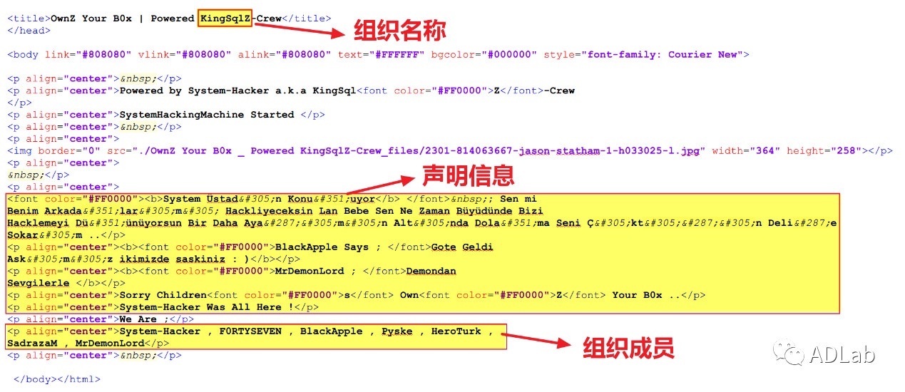 通过对攻击者的行为和所用服务器相关信息的分析和追踪,确定该次攻击来源于一批隐秘多年的土耳其黑客组织-KingSqlZ黑客组织。该组织是一个民族主义色彩非常浓厚的黑客组织,曾攻下其他国家的3千多个网站服务器,并高调的在被攻击网站上留下其组织的名称,随后消失了多年。 如今通过我们对”黑狮行动”的追踪再次挖出该黑客组织的活动迹象。本次攻击过程中,该黑客组织采用渗透手段攻下多台服务器并将其作为存放攻击代码的跳板。