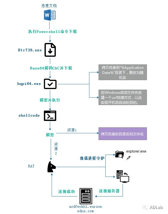 此次攻击过程开始于一个携带恶意宏的DOC文档,黑客通过伪造成简历的投递邮件手段将此恶意文件发送给攻击目标,当目标用户不慎打开文档便成为了受害者。DOC文档运行后会启动恶意宏代码并从指定的服务器下载Etr739.exe,成功下载后立即执行。新进程通过Base64解码出另一个服务器地址,继续下载恶意代码hqpi64.exe至临时目录下。恶意程序hqpi64.exe便是Warzone RAT的释放器,其通过释放Warzone RAT来执行后续操作,如将explorer.exe作为傀儡进程守护、与控制端进行通信等。