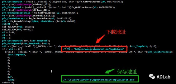 该Payload先将上图中加密的数据通过Base64解码出下载链接地址“http[:]//www.gestomarket[.]co/hqpi64.exe”,然后把hqpi64.exe更名为2XC2DF0S.exe并保存在临时目录下。