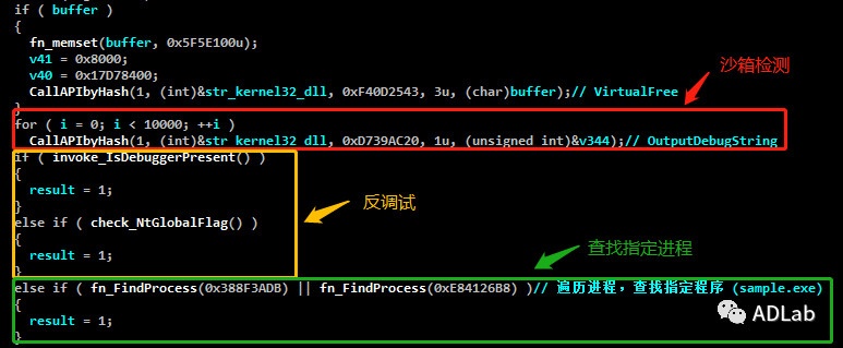 该PE Loader首先在运行过程中进行了沙箱和指定进程的检测,以防止被自动化系统分析。并且根据自带的资源数据来判定是否实施驻留本机的操作和注入体的选择。最后此PE Loader将最终选择的傀儡进程的空间架空,并把解密出的RAT模块映射到此进程中执行(原本PE文件代码被置换)。
