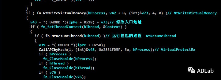 之后,程序会从自身资源内解密出PE文件“DUMP2”,通过CreateProcess、WriteProcessMemory和SetThreadContext等函数,以挂起的方式加载一个新的进程,并最终以傀儡进程的方式写入并加载“DUMP2”。