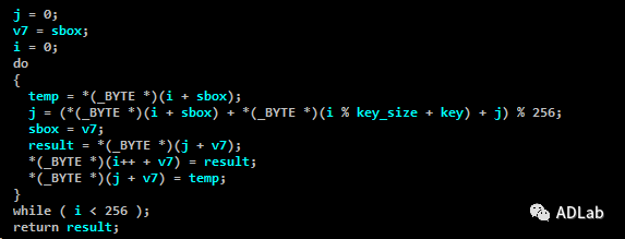 为了防止C&C被轻易发现或者批量提取,该木马将其加密后存放在“.bss”的资源节数据中。通过对解密函数的分析我们发现,这里采用了CR4算法。CR4生成一种称为密钥流的伪随机流,它是同明文通过异或操作相混合来达到加密的目的。解密时则使用密钥调度算法(KSA)来完成对大小为256个字节数组sbox的初始化及替换。具体流程如下: