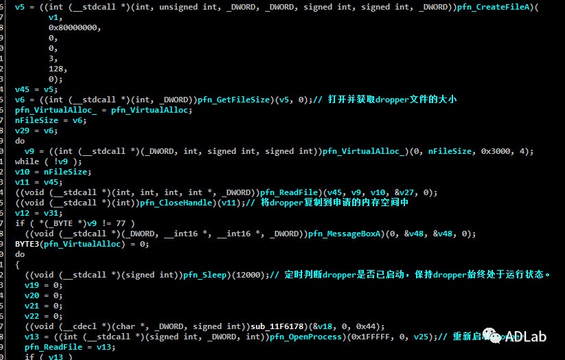 通过分析我们发现,这段注入代码的主要功能是利用傀儡进程来保护Dropper(hqpi64.exe)。其会定时检查Dropper是否处于运行状态,如被关闭,则重新启动。以此达到进程守护的目的。