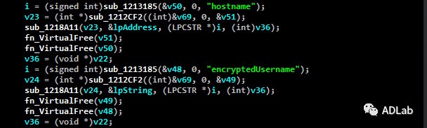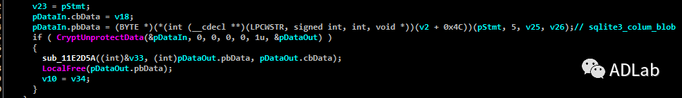 从该表中读取的内容是加密的,通过CryptUnProtectData函数对其进行解密便可以获取到明文数据。最后该木马将解密后的数据保存在名为”xxx.tmp”(”xxx“为Base64解码出的字串)的临时文件中。