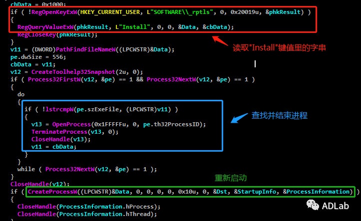 此恶意DLL的主要功能是获取注册表中的”Install”安装信息(Dropper的路径)并重新启动具有管理员权限的Dropper新进程。