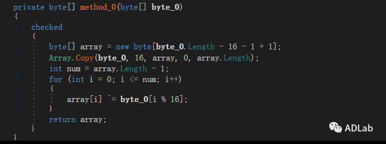 在经过逆序排列和Base64解码后的字符串(byte_0)中,前16位为解密密钥“0x28 0x49 0xf7 0x30 0xec 0x8d 0x500x80 0x94 0xaf 0x85 0xaa 0xa8 0xe7 0xc0 0x41”,之后为待解密密文。函数以16位为循环,将密钥同密文依次进行按位异或,最终解密得到“DUMP1”文件并通过CallByName函数加载执行。