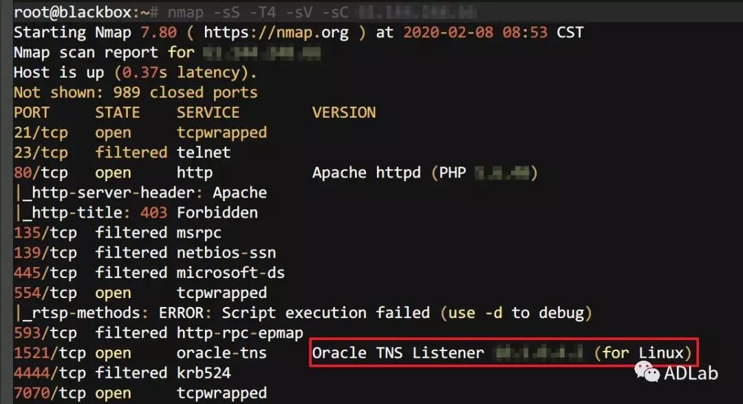 目标服务器开启了oracle数据库的默认监听端口1521,且数据库相应版本较低,可能存在诸多漏洞,这也给了攻击团伙可乘之机(1521端口是oracle数据库默认的端口,主要作用是用来监听来自客户端的数据库链接请求)。