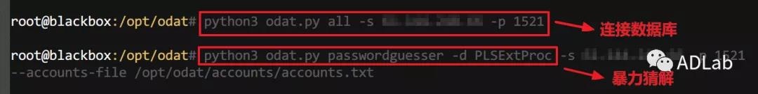 首先,攻击者通过odat攻击框架连接至目标oracle数据库,并进一步通过PasswordGuesser模块进行暴力猜解。