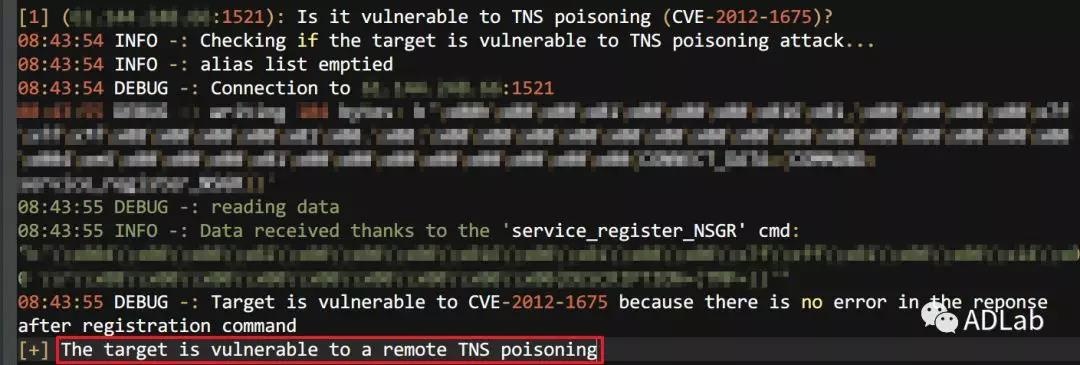 同时探测到当前oracle版本可能存在TNS poisoning (CVE-2012-1675)漏洞攻击。