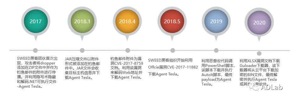 为了对黑客组织在此次攻击活动使用的策略和技术进行全面的了解,威廉希尔500欧洲指数ADLab研究人员将目前关联到的该组织近几年的主要活动做了梳理和总结,并绘制了“SWEED组织”活动时间轴(如图3-1)。从时间轴可以看出,该组织的大部分活动都具有一致性——借助带有恶意附件的鱼叉式钓鱼邮件分发远控木马程序(RAT),并且行动中使用的木马程序主要是以Agent Tesla为主。