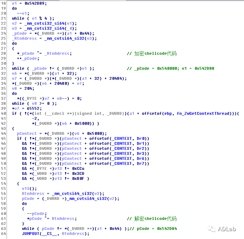 接着,恶意代码再使用自定义解密函数对下载的payload进行异或解密。其密钥储存在shellcode代码0x2032偏移处,密钥长度为0x214。解密函数内容如图4-39所示。