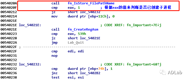 ② 根据指定地址处保存的数据内容特征(如果恶意代码未执行过创建子进程流程,那 么该地址处原数据为无效内容;否则,此处保存的是当前进程的全路径。)来判定是 否需要创建子进程。