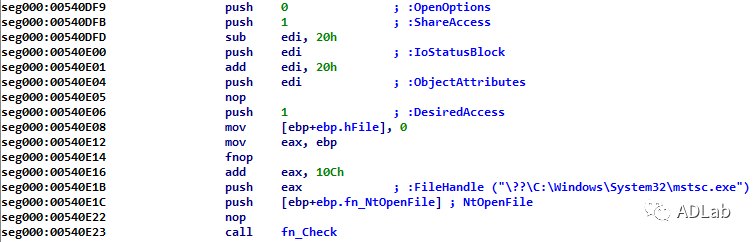 ④ 调用ZwOpenFile函数,获得映射文件mstsc.exe的句柄。