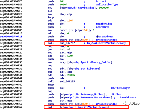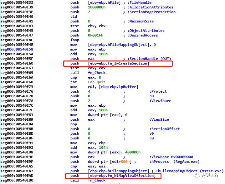 ⑤ 使用ZwCreateSection和NtMapViewOfSection函数将“mstsc.exe”文件映射到