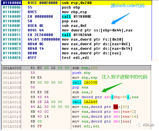 我们在恶意代码调用NtResumeThread函数前,附加RegAsm.exe进程并在注入的shellcode执行处设置断点(如图4-33),然后再继续执行该函数来恢复线程运行。该shellcode前部分与之前的操作流程相同,将前文描述的各种检测重新执行一遍,直到在“判断是否创建子进程”处跳转到另外的分支流程。下面我们继续对后续功能进行详细地分析。