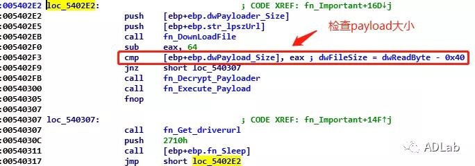 下载完成后,恶意代码再将硬编码的值与将payload的大小做比较,以此来检查文件的完整性。如果大小不匹配,恶意代码则会重新下载文件,直到完全匹配为止。