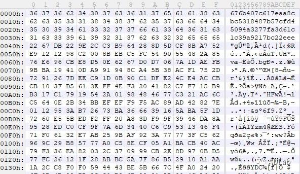下载到的payload文件是由0x40个字节的HEX小写数字和加密的PE文件组成,具体如图4-38所示。