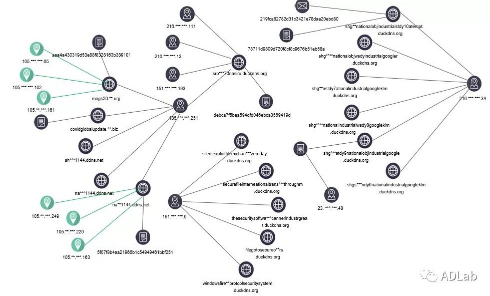 截止到目前为止,我们通过提取和整理所有关联样本中的IP地址和域名信息,可以看到此次攻击行动主要以动态域名为主,大部分域名都是通过境外的Duck DNS注册。图5-1为SWEED黑客组织使用的部分域名、IP、样本的对应关系。