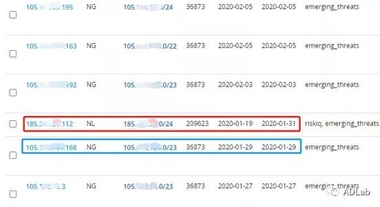 根据样本同源性分析的结果,我们发现大量的有效载荷被分别挂载在不同的动态域名中,以备包含漏洞的Office文档或恶意软件Guloader访问和下载。通过域名的查询记录所得,此次攻击活动最早可追溯到1月中下旬,同时也可以看到,它们最初均使用指向尼日利亚的基础设施。值得注意的是,这些域名解析使用的IP总不定期在常用的IP地址段来回切换。具体如图5-2所示。