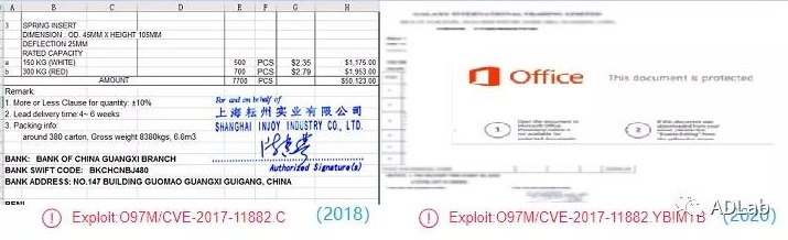 在此次行动中攻击组织使用的漏洞文档有两类(CVE-2017-11882和CVE-2014-6357),其中以CVE-2017-11882漏洞利用文档为主要攻击载荷。而SWEED组织也曾在以往的攻击行动中频繁的使用过该漏洞文档。具体如图5-4所示。