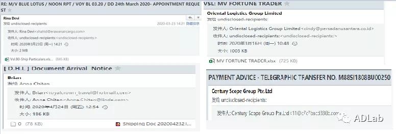 根据公开报告可以得知,SWEED黑客组织的攻击目标主要针对全球从事对外贸易的中小型企业,并且所涉及的行业主要以制造业、航运、物流和运输为主。这与我们此次监测到的攻击行动中受害者的地理位置和行业分布具有较高的相似性。图5-5列举了几例在本次攻击活动中攻击者发送给目标用户的钓鱼邮件。