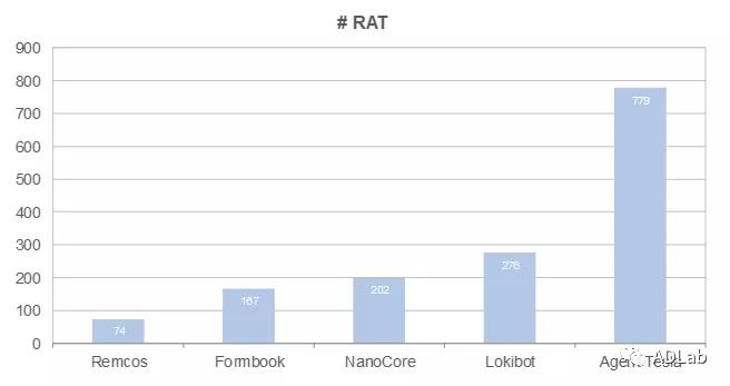 在目前观测到的行动中,攻击者最终投放的恶意软件包括Agent Tesla、Remcos、NanoCore、Formbook和Lokibot。我们将捕获的所有恶意软件按家族分类和统计,根据结果显示,Agent Tesla的占比率处于最高,是攻击者重点使用的攻击武器。而这种使用特征也曾反复出现在SWEED组织以前的攻击活动中。