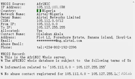 我们通过Whois信息查询,发现在此次行动中的域名“mogs20.xxx.org”早期解析的IP(105.112.XXX.XXX)地理位置指向尼日利亚,该网段归属尼日利亚地区电信的105.112段。这与SWEED组织所属国家具有高度的一致性。