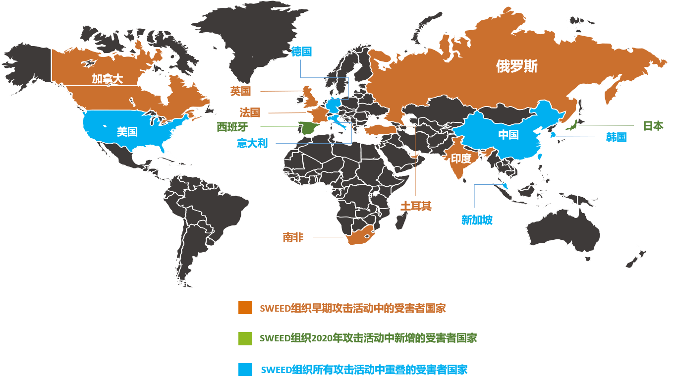 通过对已知的SWEED组织攻击行动中受害者的国家和地区分布情况进行统计(如图2-1),我们可以看到该组织发起的攻击活动覆盖了很多国家和地区,由此猜测,攻击者在攻击目标地理位置的选择上并没有特定的指向性。
