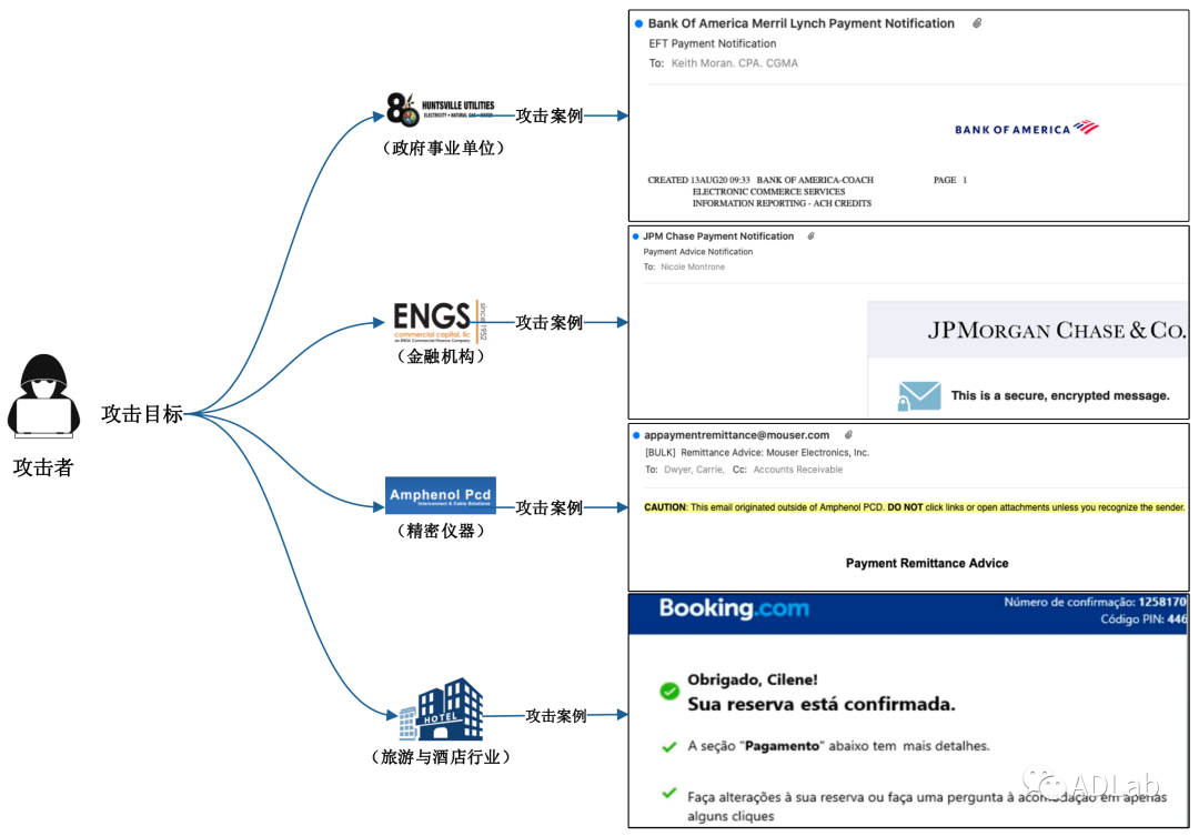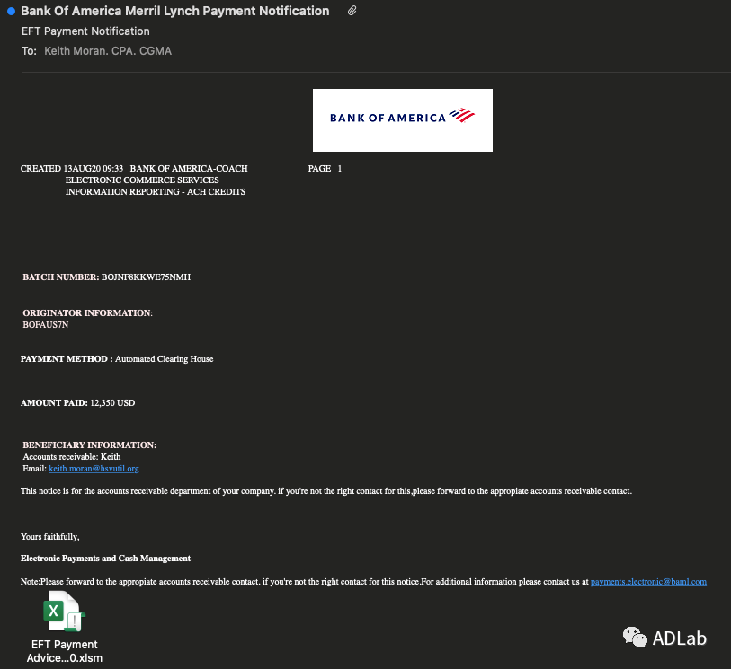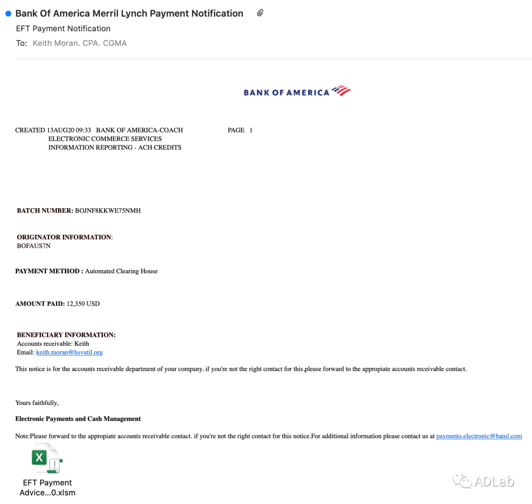 2020年8月中旬,威廉希尔500欧洲指数ADLab监测到一封题为“电子转账付款账单”的恶意邮件,该邮件以“美国银行”的名义发起钓鱼邮件攻击,其附件为一个excel表格文件(图1为本次攻击的一个邮件样本,目标为美国阿拉巴马州亨茨维尔市公共事业公司“Huntsville Utilities”),通过多级代码跳转最终向目标植入Remcos RAT,以窃取目标主机的机密信息。在初步分析后,除了零散的样本信息外,我们没有在公开情报和私有情报库中找到任何与攻击及攻击背后的黑客组织相关的信息。通过对基础设施的关联分析,发现该黑客组织与多次物联网攻击有着紧密的关系,因此我们决定对本次攻击活动及其背后的攻击团伙进行一次摸底。我们很快关联到8月初另外几起相同手法的攻击,这几起攻击伪装成了“美国大通银行”和“美国富国银行”向金融机构“ENGS”投放攻击代码(图2)。