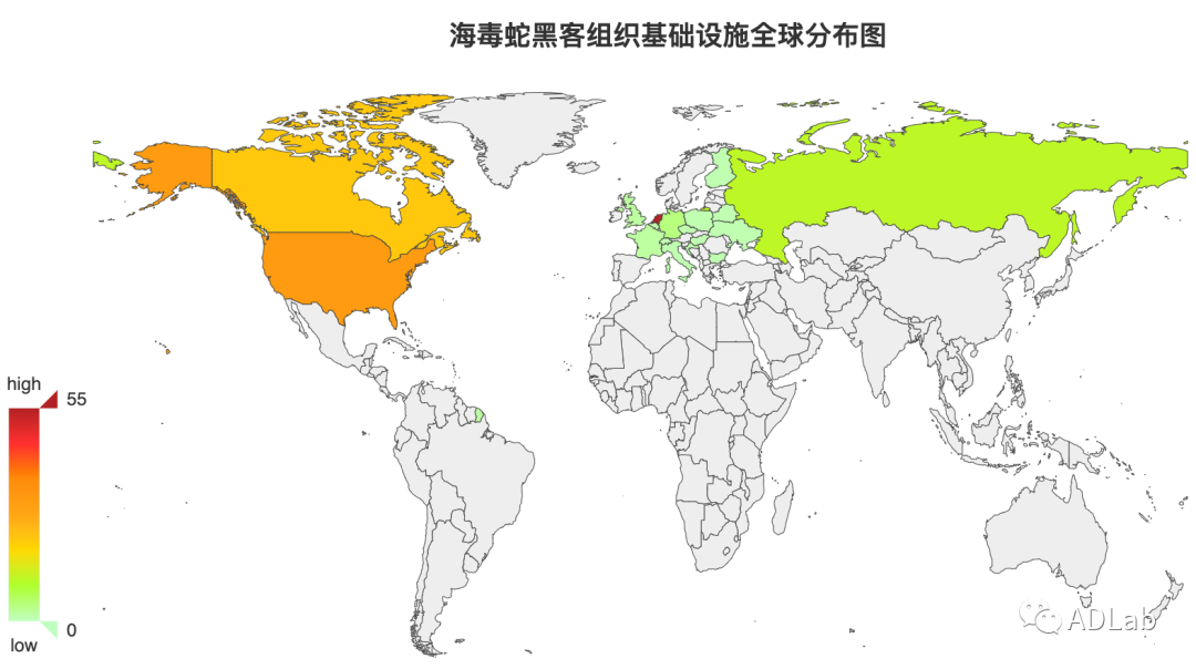 “海毒蛇”黑客组织持有大量恶意域名和用于托管恶意文件的虚拟主机等网络基础设施,我们对掌握的该黑客组织持有的142个基础设施资源进行了地理位置分布统计,发现它们主要分布在21个国家和地区,其中分布较为密集的国家为荷兰、美国、加拿大、俄罗斯和德国,尤以“荷兰”和“美国”最为密集,分别是55个和31个,图9是我们绘制的海毒蛇黑客组织基础设施全球分布图。