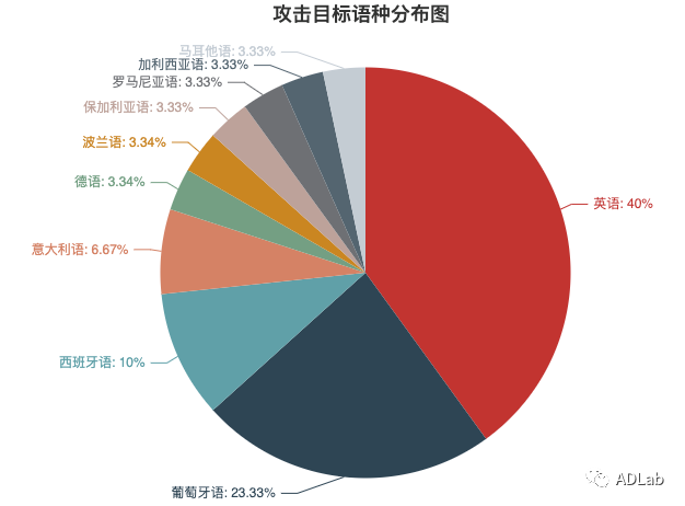 攻击目标包含著名的商业金融公司“ENGS”、政府事业机构“Huntsville Utilities”,精密仪器设计公司“PrecisionConnector Design (Pcd)”等等。攻击使用的诱饵文档大多以“保密协议”、“预算表”、“付款通知”、“采购订单”、“订单确认”、“住客名单”、“发票”和“汇款”等命名,使用了包含英语、德语、波兰语、保加利亚语、罗马尼亚语、葡萄牙语、加利西亚语、意大利语、西班牙语以及马耳他语等十多种语言,可以说攻击者的攻击目标遍布全球。诱饵文档的内容有如酒店订单图片、行政客户预订时间表、预算图片,也有故意模糊化以诱使目标用户启用宏查看更清晰的图片。图11是我们绘制的攻击目标语种分布图,从图中可以看到占比最大的分别是英语、葡萄牙语和西班牙语。
