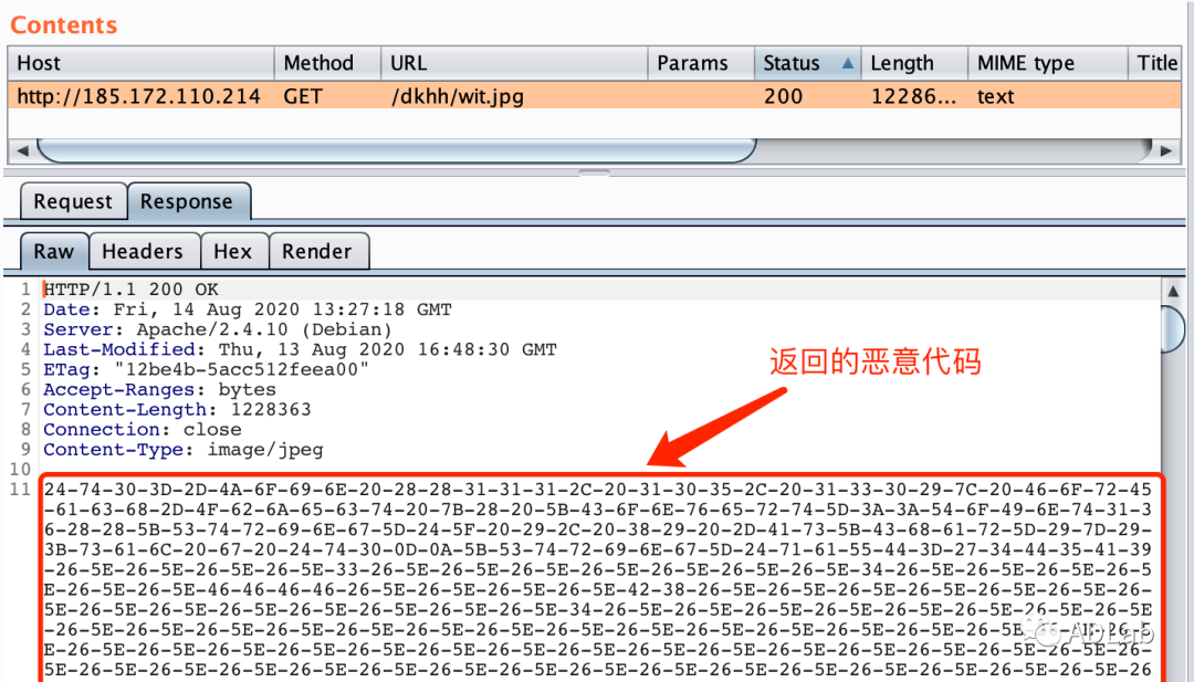 我们抓包得到的“wit.jpg”文件的部分内容见图25。可以看到文件数据经过了字符变形和混淆处理,这在很大程度上能够绕过Web应用防火墙、入侵检测系统等网络安全设备的检测,同时也增加了安全研究人员的分析成本。