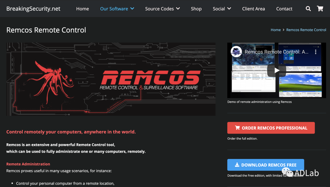 自2016年在暗网上的地下黑客社区开始出售以来,Remcos RAT非常活跃,基本上每个月都会发布两个左右的新版本。其具有键盘记录、屏幕记录、调用摄像头和麦克风进行录像录音、远程执行Shell命令、远程执行脚本、上传文件以及下载文件等功能。该工具由一家名为BreakingSecurity的公司发行出售,图27是Remcos RAT的官网界面。通过公开的信息可以发现,其已被黑客频繁地使用在各种攻击活动中。