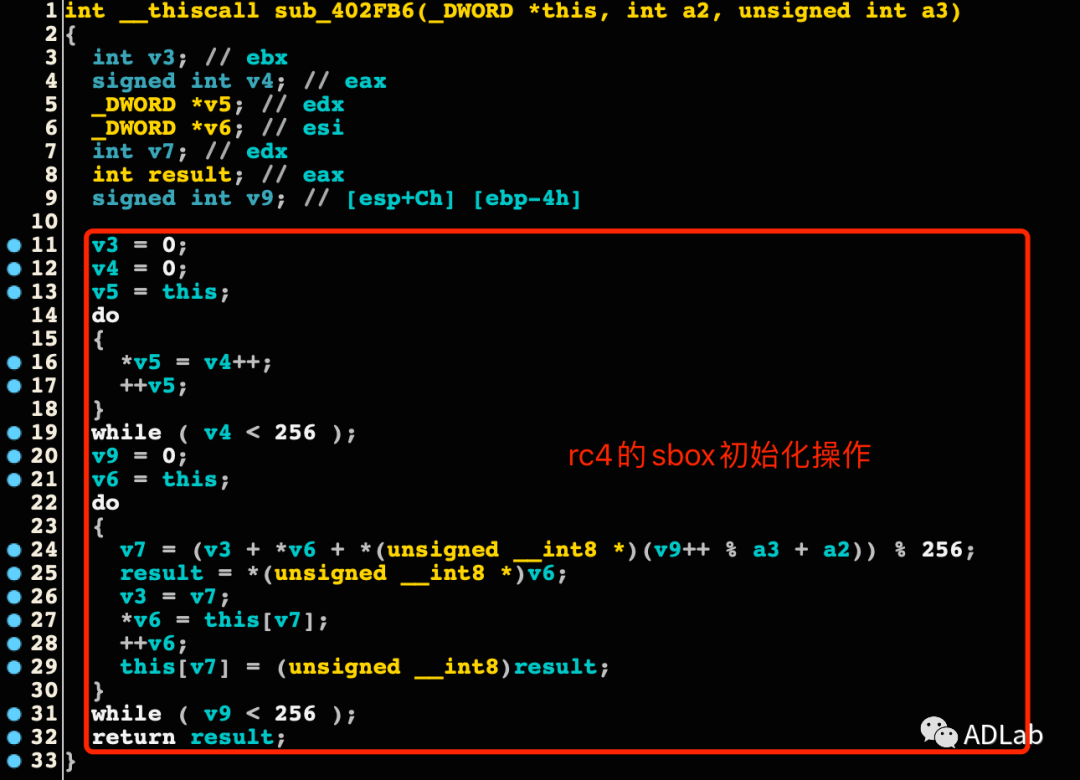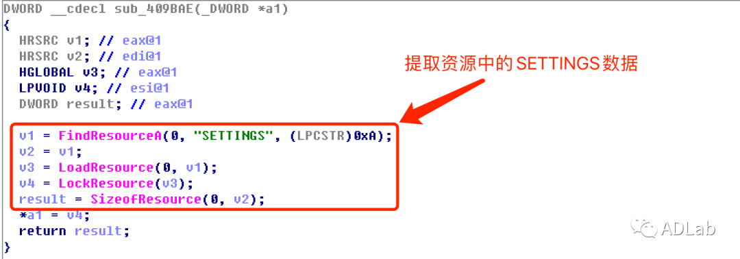 Remcos RAT木马将其“工作”需要用到的配置信息包括C&C服务器地址、网络通信加密的key、互斥对象名、licence编号,以及和截屏、录音操作等相关的其他信息,使用RC4算法加密存储在其PE资源名为“SETTINGS”的数据块中(见图29)。数据块由三部分组成,分别是key的长度、key和密文数据,图29中第一个字节0x66为key的长度,紧接着被选中蓝底的数据为key,最后是密文数据。