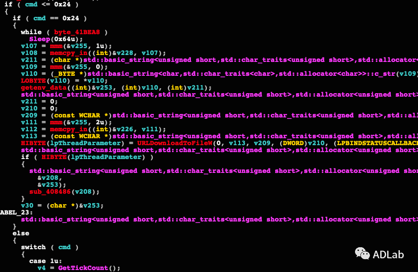 成功上线后,木马则等待C&C服务器下发控制指令以执行恶意功能。木马解析C&C服务器控制指令的代码片段见图36。这些控制指令的功能包括执行文件管理、进程管理、键盘记录、屏幕记录、调用摄像头和麦克风进行录像录音、远程执行Shell命令、远程执行脚本、上传下载文件,注册表操作、安装卸载远控等,我们将主要的控制命令和功能描述列在表4中。