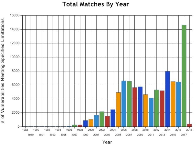 从国外新增漏洞数量来看,据NVD(美国国家漏洞数据库)最新数据表明,2017年全年新增漏洞数量14643个,历史上第一次突破1万的大关!而2016年该项数据仅为6447个,2017年新增漏洞数量较2016年增长超过一倍!