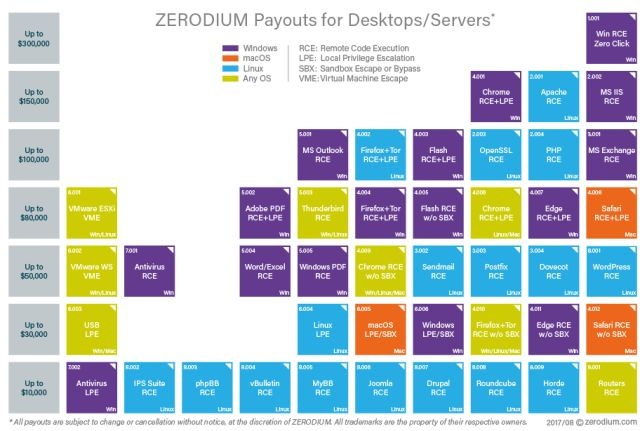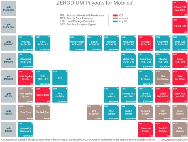从国际知名的0Day漏洞掮客ZERODIUM给出的漏洞支付价格可以看出,移动终端系统以及应用漏洞的价格明显高于传统桌面、服务器操作系统漏洞。供求关系决定漏洞价值,漏洞买家更加迫切需要新兴领域的漏洞。