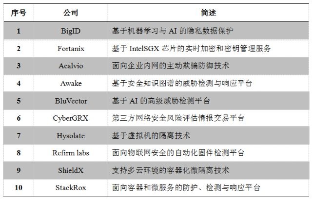 今年入围创新沙盒的Top10公司如下表所示,序号前两位分别是本届创新沙盒大赛的冠亚军,其余以字母顺序排名。