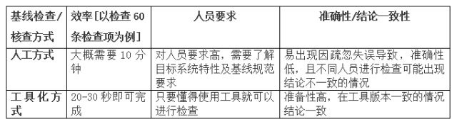 安全基线的能力建设直接影响到系统配置的安全,根据安全基线规范来看,其核心围绕技术要求和管理要求两个方面构成,包括提供一系列的检查项(Checklist)和配置建议,但对于规范的检查,需要采用人工核查、工具化产品核查两种方式来完成,对比如下表,因此,从各个方面综合考虑,工具化核查方式是必然的趋势,相比人工方式效率高且准确性更高,在很大的程度上可大大降低基线的检查成本和后期改进的成本。